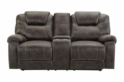 View full detailsNew Classic Furniture Anton Dual Recliner Console Loveseat with Power Footrest in Chocolate