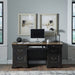 Liberty Furniture Meritage 5 Piece Junior Executive Set in Aged Charcoal w/ Rub Thru/Caramel 532-HO-5JES. Creativity starts with the Meritage 5 piece jr. Executive set. Meticulously crafted using Poplar solids with Birch and Maple veneers, this set features an Aged Charcoal with rub thru and Caramel finish and includes the jr. Executive desk, jr. Executive credenza, and jr. Executive credenza hutch. The jr. Executive desk and credenza each have 7 drawers with wood-framed fronts. Each drawer is designed to provide ample storage space while exuding timeless charm. Among these, two locking file storage drawers offer added security and organization for your important documents. Also included is a flip down keyboard drawer offering a seamless solution for your typing needs while ensuring efficient wire management. Illuminate your work area with ease, thanks to the touch LED and task lighting integrated into the hutch. Whether you're burning the midnight oil or tackling deadlines during the day, this lighting solution ensures optimal visibility for enhanced productivity. Adorned with two wood-framed glass doors, accented with Antique Pewter knob hardware, this credenza hutch exudes timeless elegance. Behind each door, discover a wealth of storage options with one adjustable wood-framed glass shelf, allowing you to showcase your prized possessions or keep essential items within easy reach. In the center, against a striking planked back panel in the Carmel finish, rests an open adjustable wood-framed glass shelf. This contrasting feature not only adds visual interest but also provides additional storage space for your convenience. With wire management provisions discreetly integrated into the design, you can bid farewell to cluttered cables and tangled wires, keeping your workspace neat and always organized. Make an impressive statement with the Meritage 5 piece jr. Executive set.